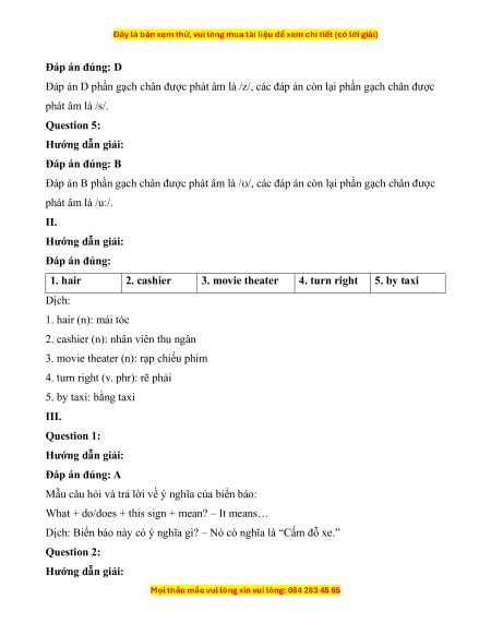 Đáp án B phần gạch chân được phát âm là /ʊ/, các đáp án còn lại phần gạch chân được phát âm là /uː/. II. Hướng dẫn giải: Đáp án đúng: 1. hair 2. cashier 3. movie theater