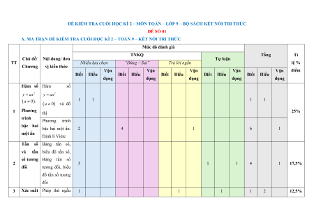 A. MA TRẬN ĐỀ KIỂM TRA CUÔI HỌC KÌ 2 – TOÁN 9 – KẾT NÔI TRI THỨC Mức độ đánh giá TNKQ Tổng Tỉ