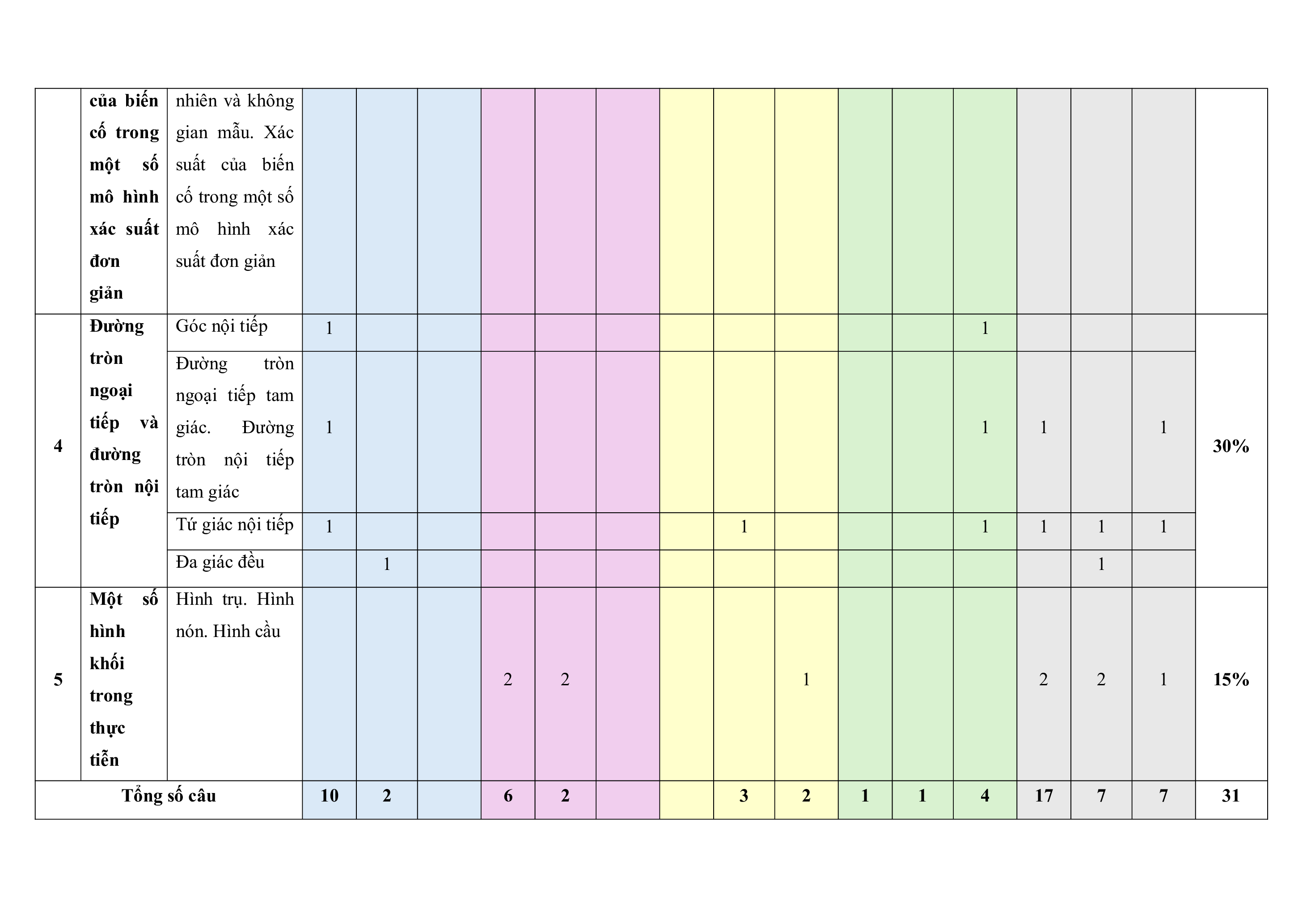 Một số Hình tru. Hình hình nón. Hình câu khối 5 2 2 1 2 2 1 15% trong thực tiên Tổng số câu 10 2 6 2 3 2 1 1 4 17 7 7 31 Tổng số điểm 3,0 2,0 2,0 3,0 4,0 3,0 3,0 10,0 Tỉ lệ % 30 20 20 30 40 30 30 100 Lưu ý:
