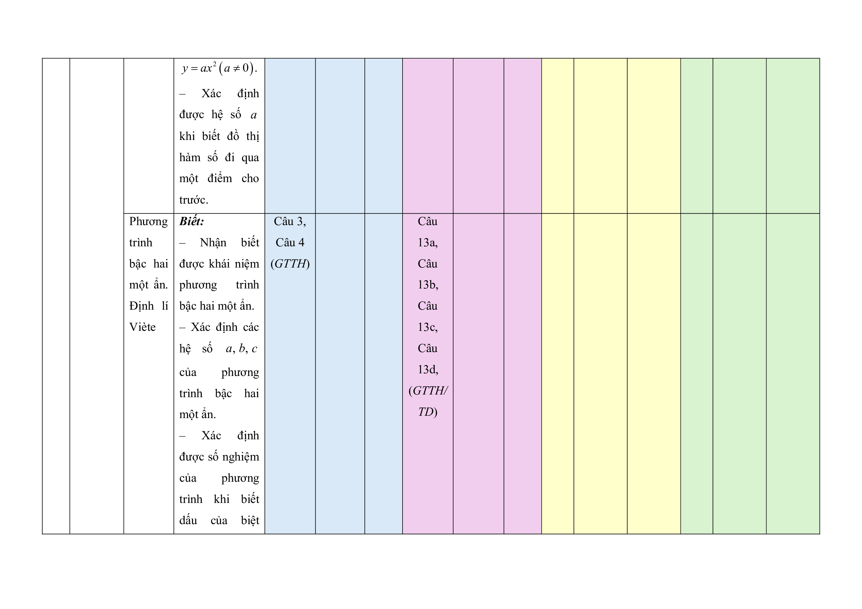 Chủ đề/ Nội dung/ đơn Tự luận TT Nhiều lựa chọn “Đúng – Sai” Trả lời ngắn lệ % Chương vị kiến thức Vận Vận Vận Vận Vận điểm Biết Hiểu Biết Hiểu Biết Hiểu Biết Hiểu Biết Hiểu dụng dụng dụng dụng dụng Hàm số Hàm số 2 y ax 2 y ax a 0. 1 1 1 1 a 0 và đồ 1 Phương thị 25% trình Phương trình