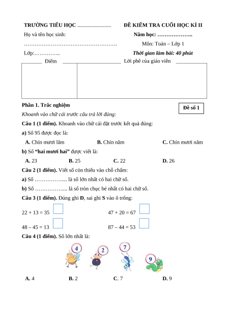 ……………………………………………. Môn: Toán – Lớp 1 Lớp:…………...