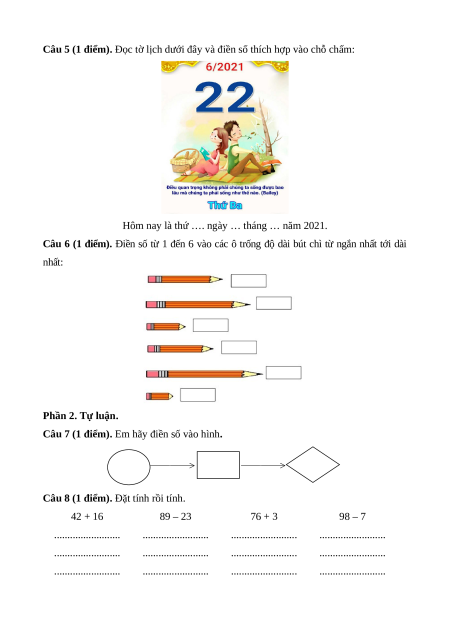 Câu 5 (1 điểm). Đọc tờ lịch dưới đây và điền số thích hợp vào chỗ chấm: