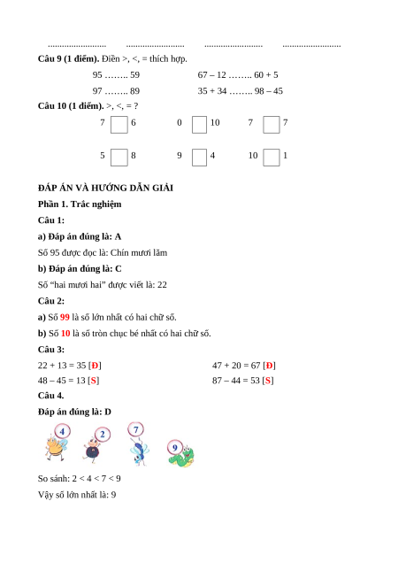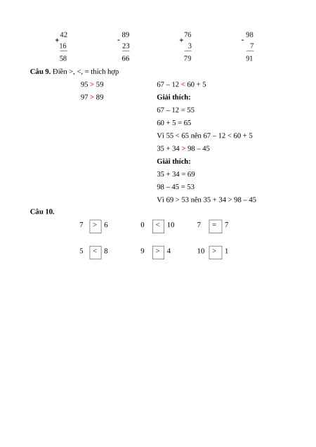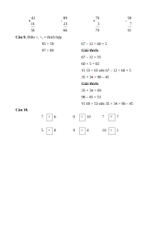Câu 9 (1 điểm). Điền >, <, = thích hợp. 95 …….. 59 67 – 12 …….. 60 + 5 97 …….. 89 35 + 34 …….. 98 – 45