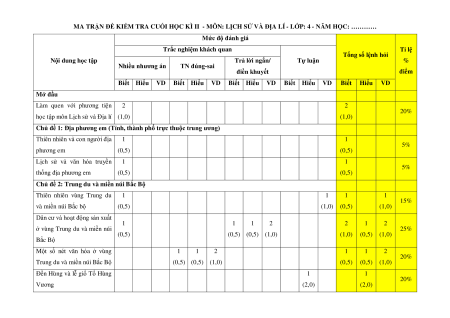 MA TRẬN ĐỀ KIỂM TRA CUỐI HỌC KÌ II - MÔN: LỊCH SỬ VÀ ĐỊA LÍ - LỚP: 4 - NĂM HỌC: …………