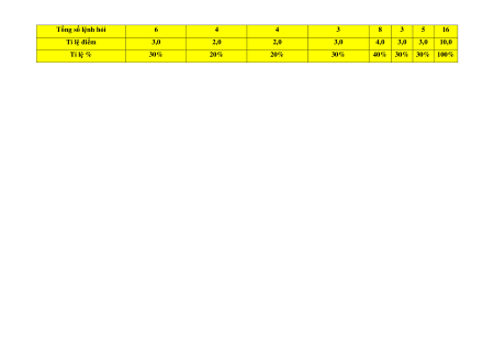 Tổng số lệnh hỏi 6 4 4 3 8 3 5 16 Tỉ lệ điểm 3,0 2,0 2,0 3,0 4,0 3,0 3,0 10,0 Tỉ lệ % 30% 20% 20% 30% 40% 30% 30% 100%