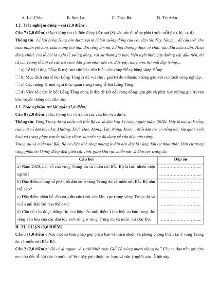 Câu 6 (0,5 điểm): Nhà máy thủy điện nào sau đây không thuộc vùng Trung du và miền núi Bắc Bộ? A. Lai Châu. B. Sơn La. C. Thác Bà. D. Trị AAn.