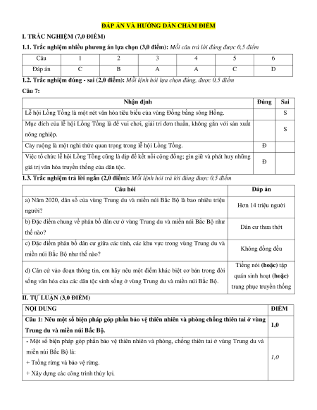 Câu 5 (0,5 điểm): Khí hậu vùng Trung du và miền núi Bắc Bộ là khí hậu nhiệt đới ẩm gió mùa, có