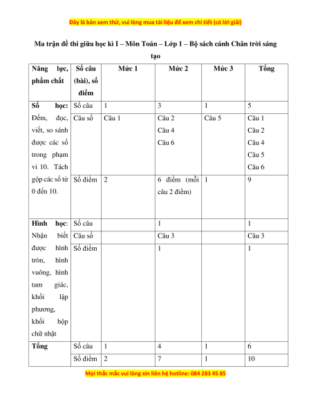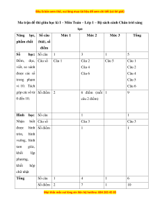 Ma trận đề thi giữa học kì I – Môn Toán – Lớp 1 – Bộ sách cánh Chân trời sáng tạo Năng lực, Số câu Mức 1 Mức 2 Mức 3 Tổng phẩm chất (bài), số điểm Số học: Số câu 1 3 1 5 Đếm, đọc, Câu số Câu 1 Câu 2 Câu 5 Câu 1 viết, so sánh Câu 4 Câu 2 được các số Câu 6 Câu 4 trong phạm Câu 5 vi 10. Tách Câu 6
