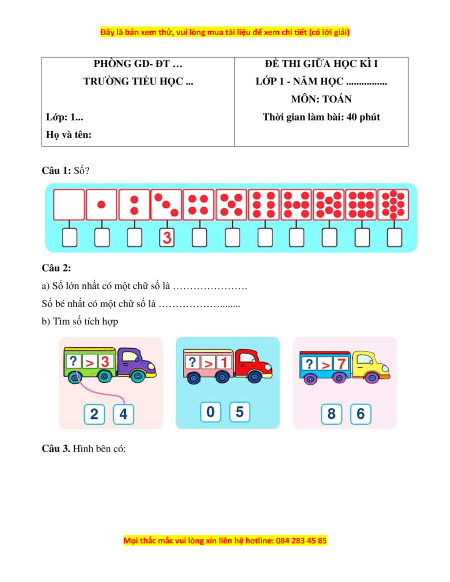 - Tailieugiaovien.com.vn giới thiệu bộ 5 đề thi giữa kì 1 Toán 1 Chân trời sáng tạo mới nhất nhằm giúp Giáo viên có thêm tài liệu tham khảo ra đề thi Toán lớp 1.