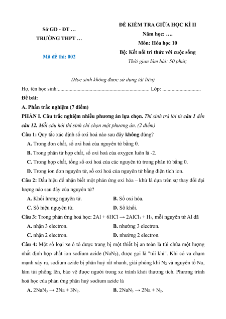 Bộ 5 đề thi giữa kì 2 Hóa học 10 Kết nối tri thức Cấu trúc mới