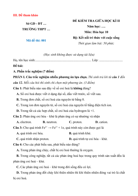ĐỀ KIỂM TRA GIỮA HỌC KÌ II Môn: Hóa học 10