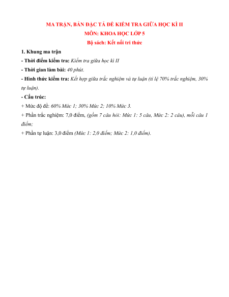 - Tailieugiaovien.com.vn giới thiệu bộ 5 đề giữa kì 2 gồm đầy đủ ma trận và lời giải chi tiết môn Khoa học lớp 5 Kết nối tri thức mới nhất năm 2026 nhằm giúp Giáo viên có thêm tài liệu tham khảo ra đề thi Khoa học lớp 5.