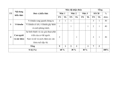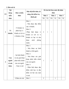 Mức độ kiến thức, kĩ dung Đơn vị kiến thức TT năng cần kiểm tra, kiến thức Mức 1 Mức 2 Mức 3 đánh giá thức TN TL TN TL TN TL Mức 1: - Nêu được đặc điểm của vi khuẩn. - Vi khuẩn và Mức 2: Vi phân loại vi 1 -Phân biệt được vi 2 1 1