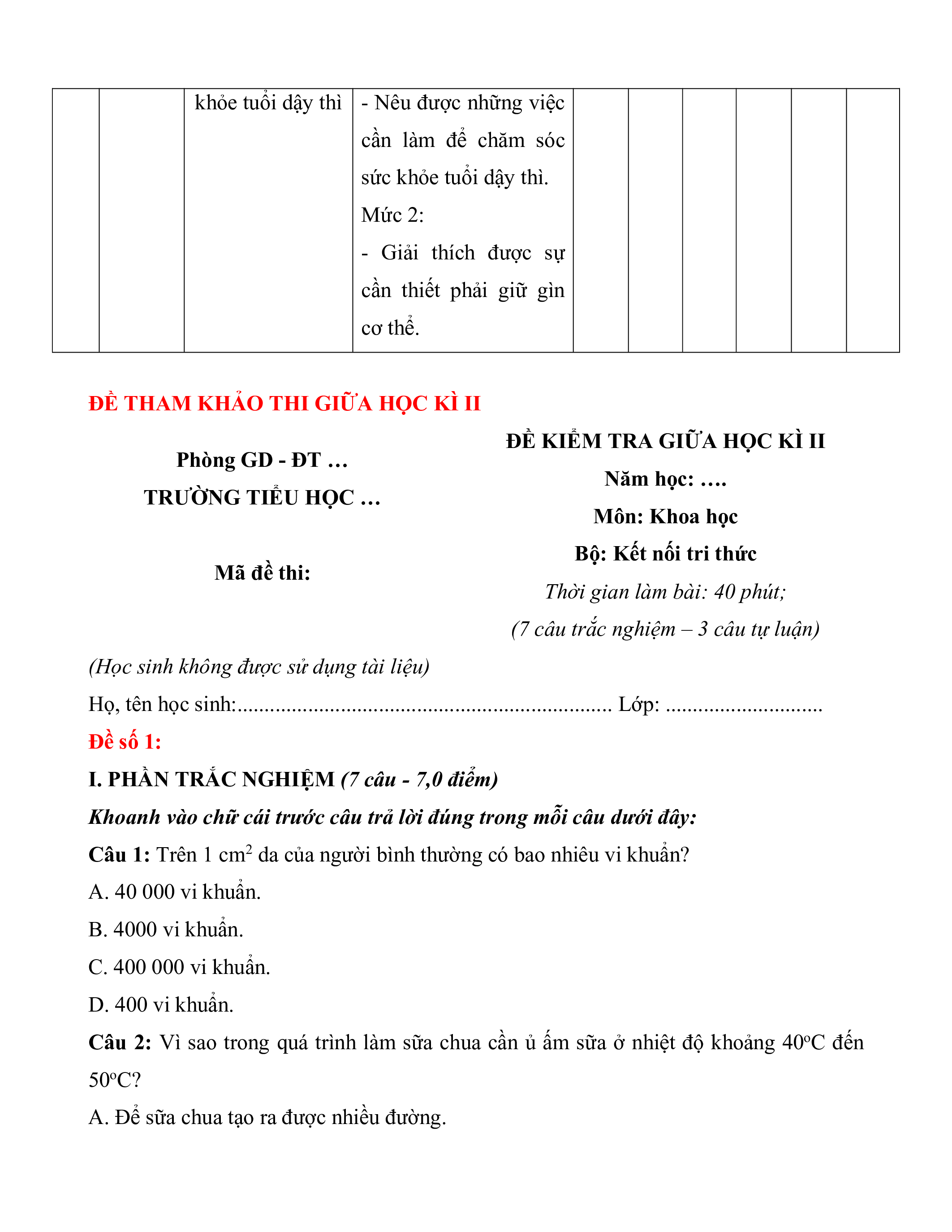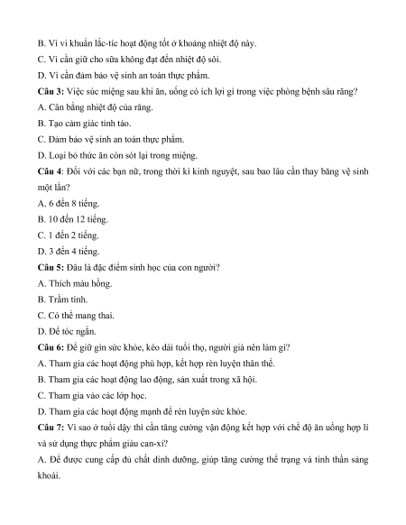Câu 1: Trên 1 cm2 da của người bình thường có bao nhiêu vi khuẩn? A. 40 000 vi khuẩn. B. 4000 vi khuẩn. C. 400 000 vi khuẩn. D. 400 vi khuẩn.
