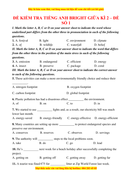 ĐỀ KIỂM TRA TIẾNG ANH BRIGHT GIỮA KÌ 2 – ĐỀ SỐ 1