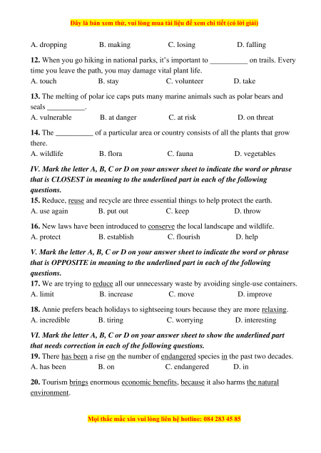 V. Mark the letter A, B, C or D on your answer sheet to indicate the word or phrase