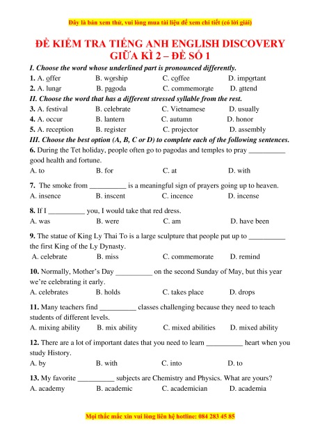 ĐỀ KIỂM TRA TIẾNG ANH ENGLISH DISCOVERY