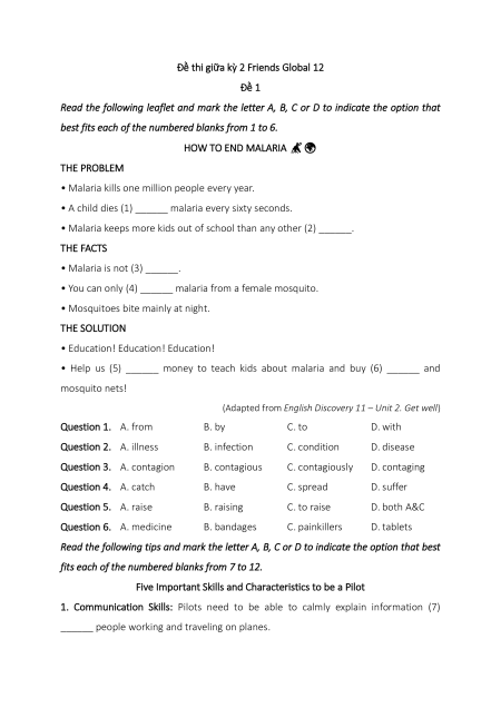 (Adapted from English Discovery 11 – Unit 2. Get wel ) Question 1. A. from B. by C. to D. with Question 2. A. il ness B. infection C. condition D. disease Question 3. A. contagion B. contagious C. contagiously D. contaging Question 4. A. catch B. have C. spread D. suffer Question 5. A. raise B. raising C. to raise D. both A&C Question 6. A. medicine B. bandages C. painkil ers D. tablets