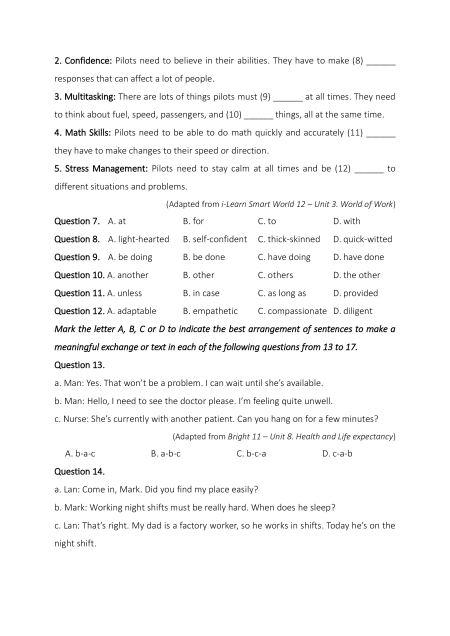 (Adapted from i-Learn Smart World 12 – Unit 3. World of Work) Question 7. A. at B. for C. to D. with Question 8. A. light-hearted