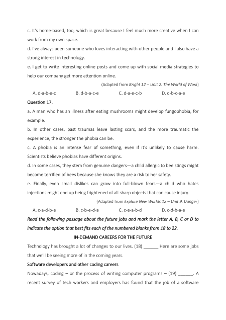 (Adapted from Bright 12 – Unit 2. The World of Work) A. d-a-b-e-c B. d-b-a-c-e C. d-a-e-c-b D. d-b-c-a-e Question 17.