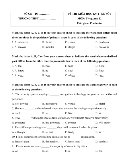 TRƯỜNG THPT ……………… MÔN: Tiếng Anh 12 Thời gian: 45 minutes