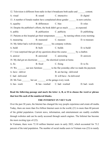 popular types these numbers still strongly indicate that the Internet has of mass media in Viet Nam today. 21. A. which B. this C. that D. who 22. A. virtual reality B. fake news C. the press D. mass media 23. A. important B. equivalent C. similar D. different 24. A. distribute B. activate C. observe D. represent 25. A. Additionally B. However C. Therefore D. To sum up