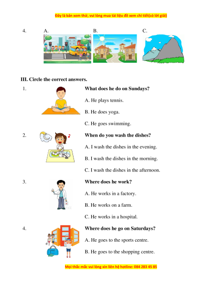 C. I wash the dishes in the afternoon. 3. Where does he work? A. He works in a factory. B. He works on a farm. C. He works in a hospital. 4.