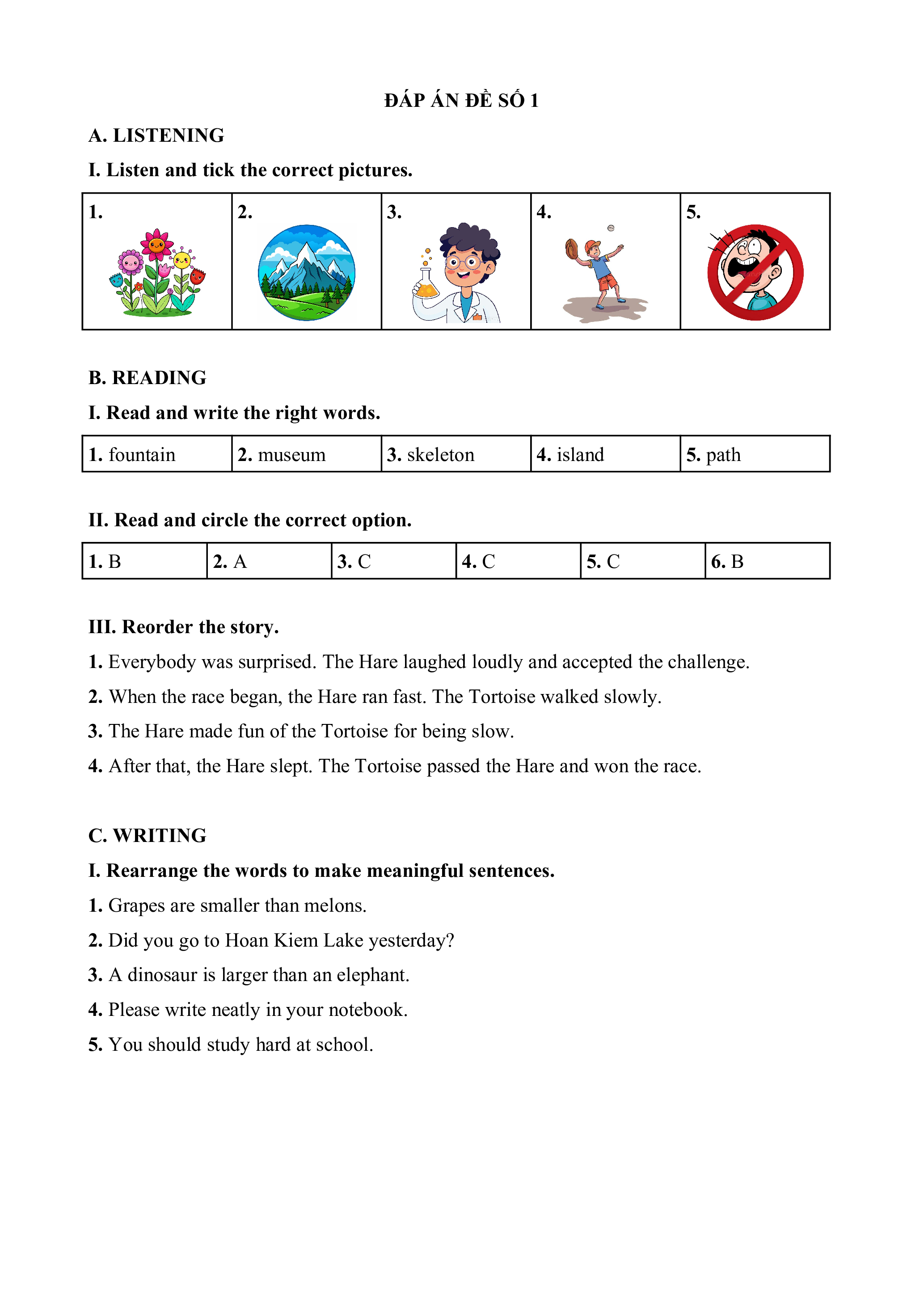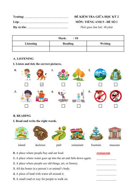 MÔN: TIẾNG ANH 5 - ĐỀ SỐ 1