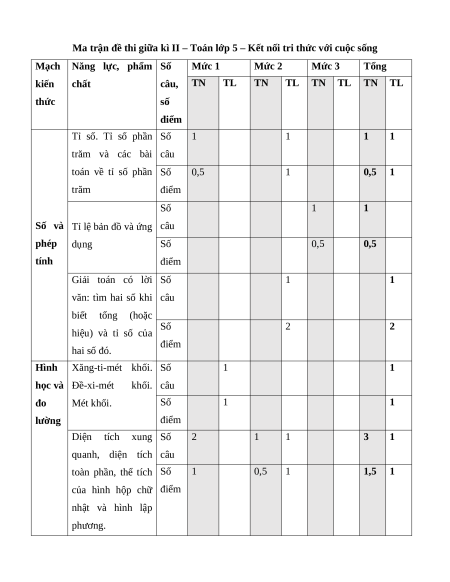Ma trận đề thi giữa kì II – Toán lớp 5 – Kết nối tri thức với cuộc sống