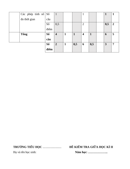 của hình hộp chữ điểm nhật và hình lập phương. Các phép tính số Số 1 1 1 1 đo thời gian câu Số 0,5 2 0,5 2 điểm Tổng Số 4 1 1 4 1 6 5 câu Số 2 1 0,5 6 0,5 3 7 điểm