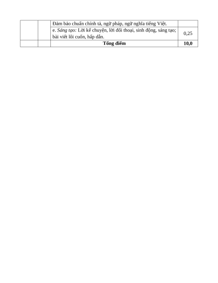 e. Sáng tạo: Lời kể chuyện, lời đối thoại, sinh động, sáng tạo; 0,25