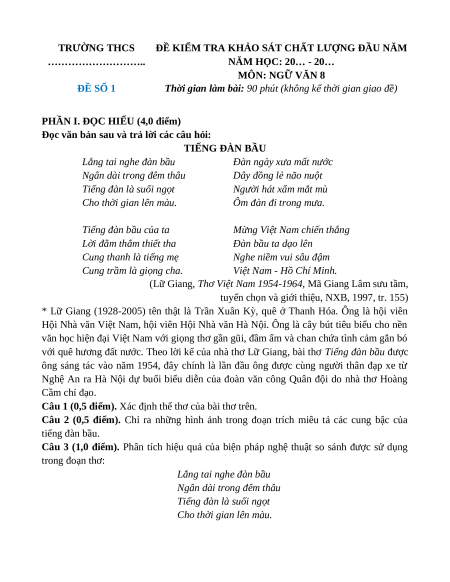 Câu 3 (1,0 điểm). Phân tích hiệu quả của biện pháp nghệ thuật so sánh được sử dụng trong đoạn thơ: Lắng tai nghe đàn bầu Ngân dài trong đêm thâu