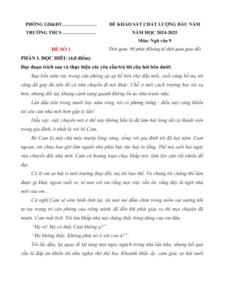 TRƯỜNG THCS ………………… NĂM HỌC 2024-2025 Môn: Ngữ văn 9 ĐỀ SỐ 1