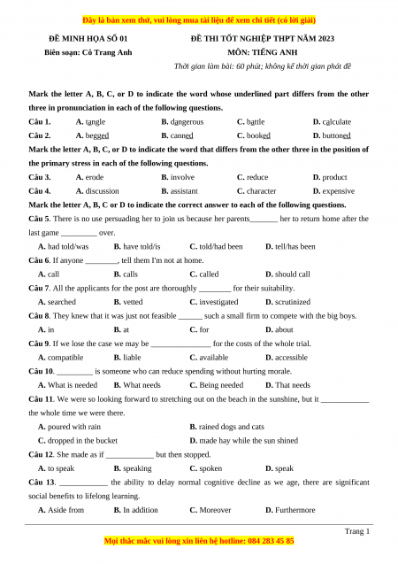 Bộ 50 đề thi thử THPT QG Tiếng anh năm 2022-2023 có lời giải chi tiết được cô Trang Anh biên soạn công phu bám sát đề thi minh họa của Bộ GD&ĐT.