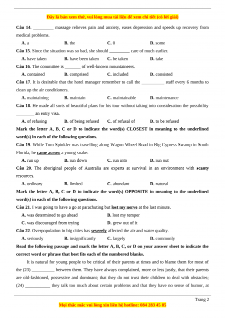 Câu 14. _________ massage relieves pain and anxiety, eases depression and speeds up recovery from medical problems. A. a B. the C. 0 D. some