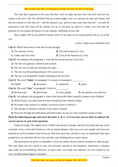 Câu 34. The word “they” in paragraph 3 refers to __________. A. the four sons B. green buds C. trees, people