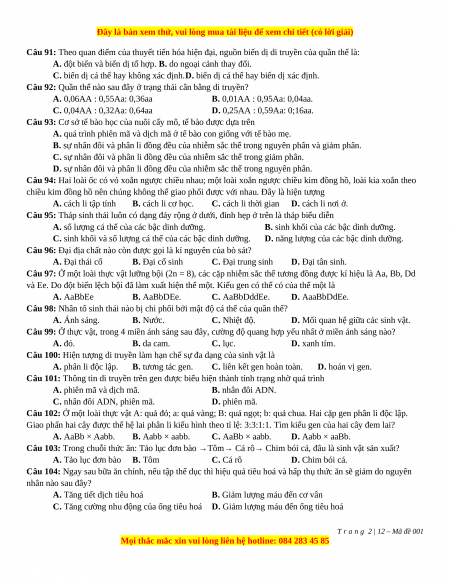 Câu 100: Hiện tượng di truyền làm hạn chế sự đa dạng của sinh vật là