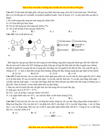 Câu 117: Ở một quần thể ngẫu phối, mỗi gen quy định một tính trạng, alen trội là trội hoàn toàn. Thế hệ ban