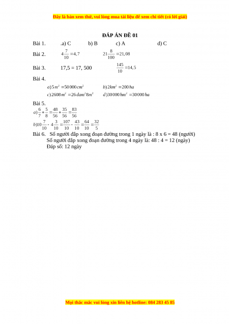 ĐÁP ÁN ĐỀ 01 Bài 1. .a) C b) B c) A d) C Bài 2. Bài 3. 17,5 = 17, 500 Bài 4. Bài 5.