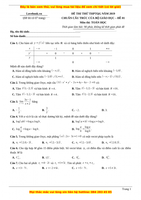 CHUẨN CẤU TRÚC CỦA BỘ GIÁO DỤC – ĐỀ 01 Môn thi: TOÁN HỌC