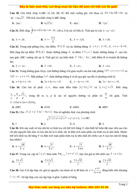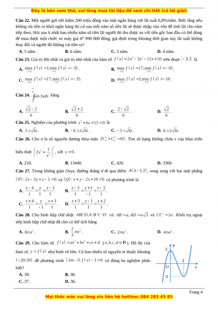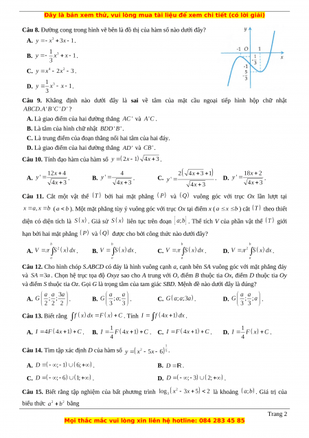 tiếp hình hộp chữ nhật đã cho có thể tích bằng A. . B. . C. . D. . Câu 29. Cho hàm số ( ). Đồ thị của hàm số