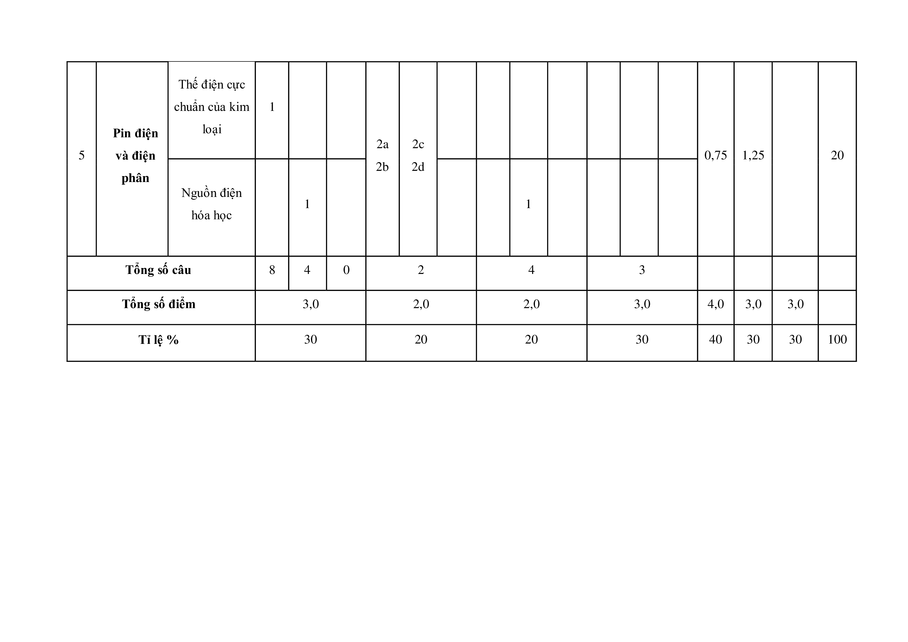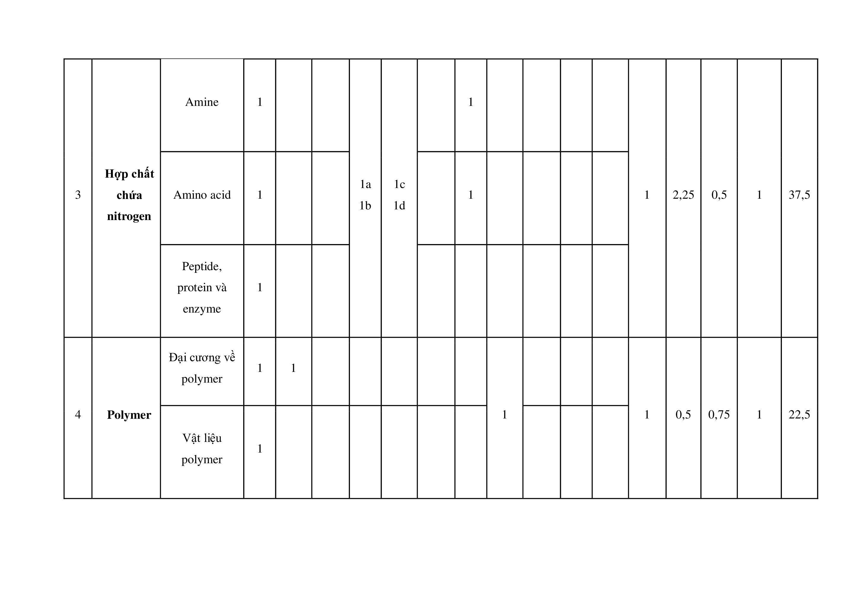 Mức độ đánh giá Tổng điểm % điểm Nội TNKQ TT Chủ đề dung/đơn Tự luận vi ̣kiến thức Nhiều lựa chọn “Đúng – Sai” Trả lời ngắn Vận Vận Vận Vận Vận Biết Hiểu Biết Hiểu Biết Hiểu Biết Hiểu Biết Hiểu dụng dụng dụng dụng dụng Ester – Lipid. Ester - 1 Xà phòng và 1 1 0,25 0,25 5 Lipid chất giặt rửa Glucose – fructose. Carbohy 2 Saccharose – 1 1 1 0,25 0,25 1 15 drate maltose. Tinh bột - cellulose Amine 1 1 Hợp chất 1a 1c 3 chứa Amino acid 1 1 1 2,25 0,5 1 37,5 1b 1d nitrogen Peptide, protein và 1 enzyme Đại cương về 1 1 polymer 4 Polymer 1 1 0,5 0,75 1 22,5 Vật liệu 1 polymer Thế điện cực chuẩn của kim 1 Pin điện loại 2a 2c 5 và điện 0,75 1,25 20 2b 2d phân Nguồn điện 1 1 hóa học Tổng số câu 8 4 0 2 4 3 Tổng số điểm 3,0 2,0 2,0 3,0 4,0 3,0 3,0 Tỉ lệ % 30 20 20 30 40 30 30 100