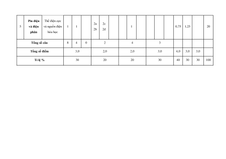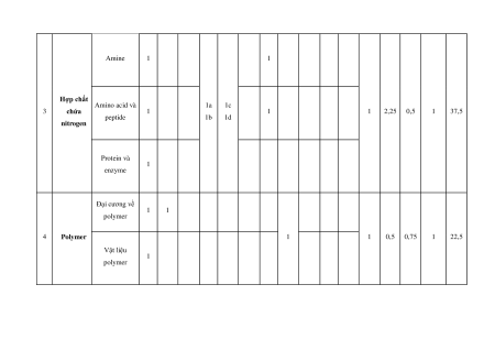 Hợp chất Amino acid và 1a 1c 3 chứa 1 1 1 2,25 0,5 1 37,5 peptide 1b 1d nitrogen Protein và 1 enzyme Đại cương về 1 1 polymer 4 Polymer 1 1 0,5 0,75 1 22,5 Vật liệu 1 polymer Pin điện Thế điện cực 2a 2c 5 và điện và nguồn điện 1 1 1 0,75 1,25 20 2b 2d phân hóa học Tổng số câu 8 4 0 2 4 3 Tổng số điểm 3,0 2,0 2,0 3,0 4,0 3,0 3,0 Tỉ lệ % 30 20 20 30 40 30 30 100