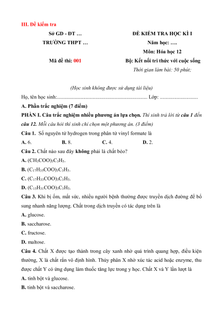 - Tailieugiaovien.com.vn giới thiệu bộ 6 đề Cuối kì 1 gồm 3 đề cấu trúc mới Trắc nghiệm khách quan: Trắc nghiệm một lựa chọn đúng; Trắc nghiệm đúng sai; Trắc nghiệm trả lời ngắn, Tự luận và 3 đề đầy đủ ma trận và lời giải chi tiết môn Hóa học 12 Kết nối tri thức mới nhất năm 2024 nhằm giúp Giáo viên có thêm tài liệu tham khảo ra đề thi Hóa học 12.
