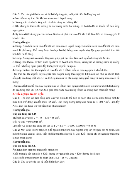 d. Sự trao đổi khí oxygen và carbon dioxide ở phổi và trao đổi khí ở tế bào diễn ra theo nguyên lí khuếch tán. Hướng dẫn giải