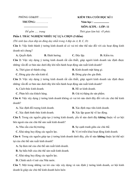 Câu 1: Việc hình thành ý tưởng kinh doanh sẽ có vai trò như thế nào đối với các hoạt động kinh doanh nói chung? A. Quyết định. B. Định hướng. C. Độc lập. D. Kiểm tra.