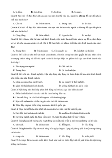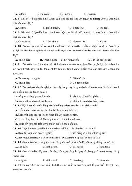 Câu 9: Khi nói về đạo đức kinh doanh của một chủ thể nào đó, người ta không đề cập đến phẩm chất nào dưới đây? A. Công bằng. B. Liêm chính. C. Nguyên tắc. D. Vụ lợi.
