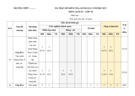 Tổng số lệnh hỏi STT Tự luận % chương kiến thức Nhiều lựa chọn Đúng - sai điểm Biết Hiểu VD Biết Hiểu VD Biết Hiểu VD Biết Hiểu VD Hành trình phát triển của văn 3 2 3 2 minh Đông 12,5% (0,75) (0,5) (0,75) (0,5) Chủ đề 5. Nam Á thời Văn minh cổ - trung 5 Đông Nam Á đại thời cổ - Thành tựu trung đại tiêu biểu của văn minh 3 2 2 2 5 4 22,5% Đông Nam (0,75) (0,5) (0,5) (0,5) (1,25) (1,0) Á thời cổ - trung đại 6 Chủ đề 6. Văn minh 3 1 1 1 3 2 1 40% Một số nền Văn Lang - (0,75) (0,25)