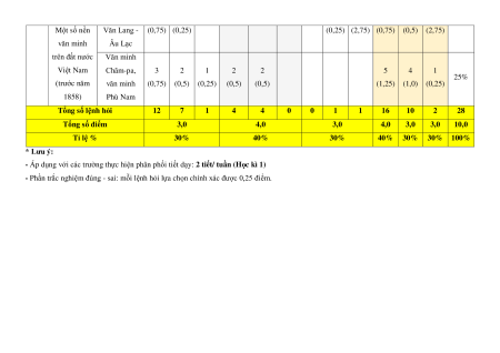 (0,25) (2,75) (0,75) (0,5) (2,75) văn minh Âu Lạc trên đất nước Văn minh Việt Nam Chăm-pa, 3 2 1 2 2 5 4 1 25% (trước năm văn minh (0,75) (0,5) (0,25) (0,5) (0,5) (1,25) (1,0) (0,25) 1858) Phù Nam