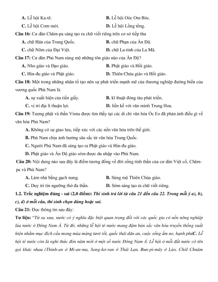 Câu 15: Lễ hội truyền thống nào sau đây thuộc văn minh Chăm-pa?